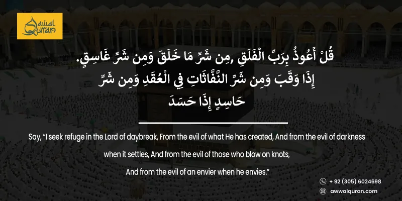 .قُلْ أَعُوذُ بِرَبِّ الْفَلَقِ ,مِن شَرِّ مَا خَلَقَ وَمِن شَرِّ غَاسِقٍ إِذَا وَقَبَ وَمِن شَرِّ النَّفَّاثَاتِ فِي الْعُقَدِ وَمِن شَرِّ حَاسِدٍ إِذَا حَسَدَ